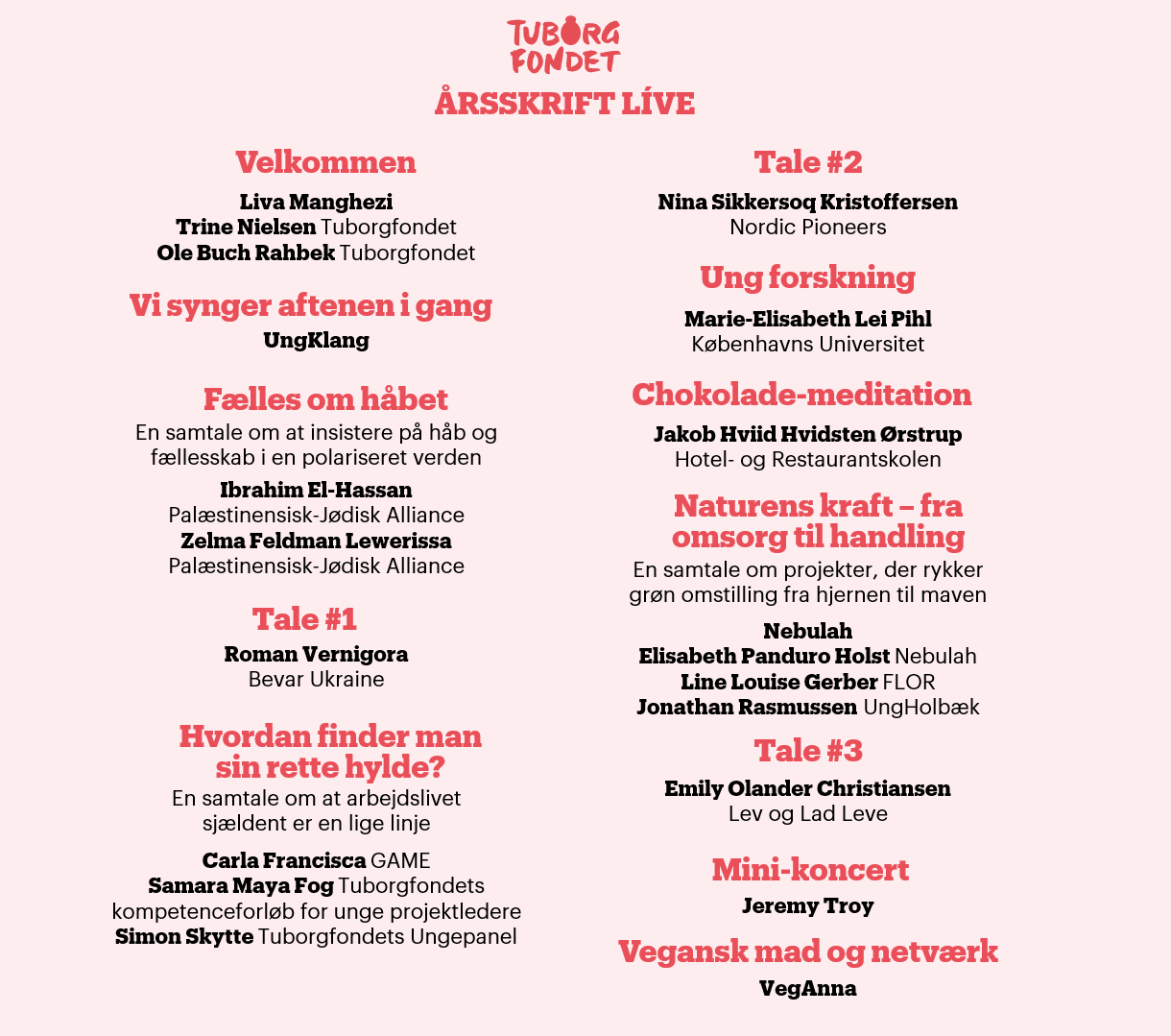 Traditionen tro inviterer Tuborgfondet til en festlig eftermiddag og aften, hvor vi sammen ser tilbage på året der gik med unges drømme i centrum. Årsskrift Live er et miks af debatter, samtaler og selvfølgelig live-musik.