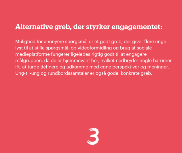 “Vi satte evalueringerne i gang, fordi vi gerne ville have et bedre indblik i projekterne og deres læring. Vi udvalgte fem projekter til nærmere evaluering, fordi de eksperimenterer med nogle spændende formater eller særlige målgrupper af unge. Men det var ikke et let valg, for der var rigtig mange forskellige projekter at vælge imellem.”